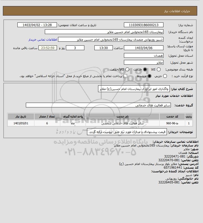 شرح کلی نیاز: واگذاری امور اپراتوری بیمارستان امام حسین(ع) ملایر