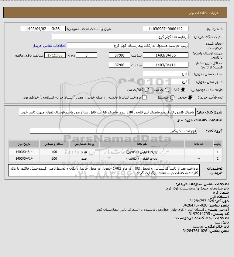 | 2 | -- | باتری قلیایی (آلکالاین) | عدد | 100 | 1403/04/14 |