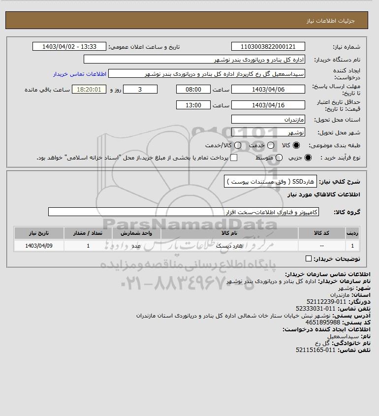 شرح کلی نیاز: هاردSSD ( وفق مستندات پیوست )