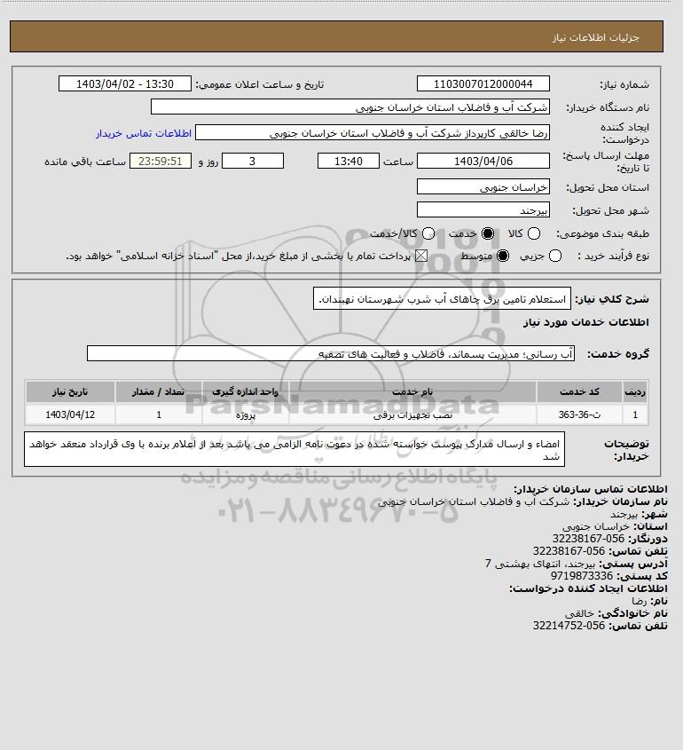 شرح کلی نیاز: استعلام تامین برق چاهای آب شرب شهرستان نهبندان.