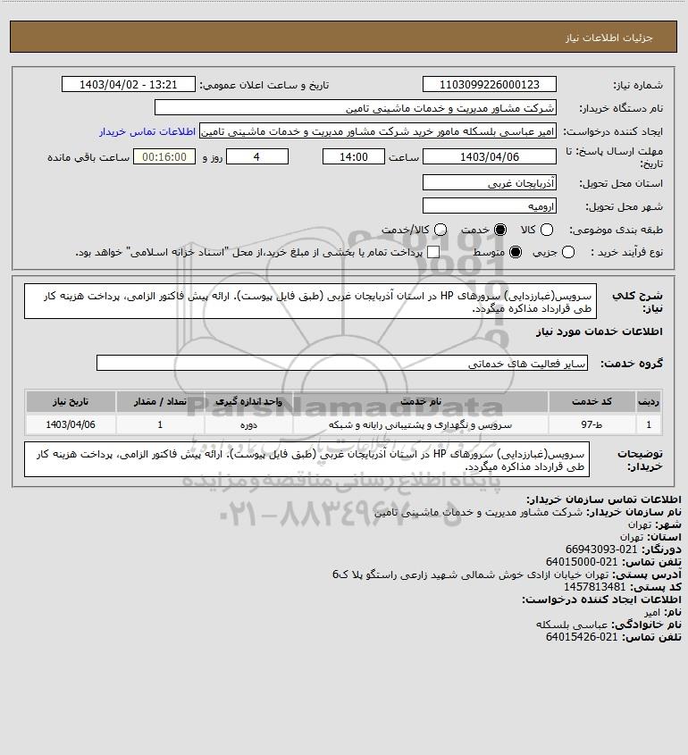 شرح کلی نیاز: سرویس(غبارزدایی) سرورهای HP در استان آذربایجان غربی (طبق فایل پیوست). ارائه پیش فاکتور الزامی، پرداخت هزینه کار طی قرارداد مذاکره میگردد.