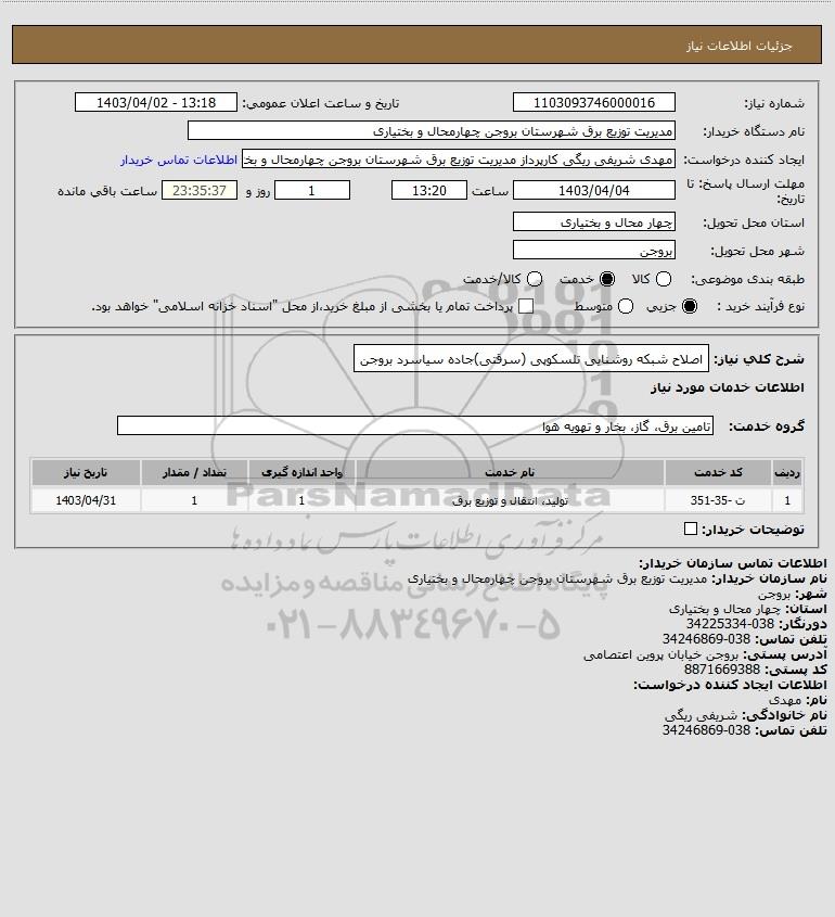 شرح کلی نیاز: اصلاح شبکه روشنایی تلسکوپی (سرقتی)جاده سیاسرد بروجن