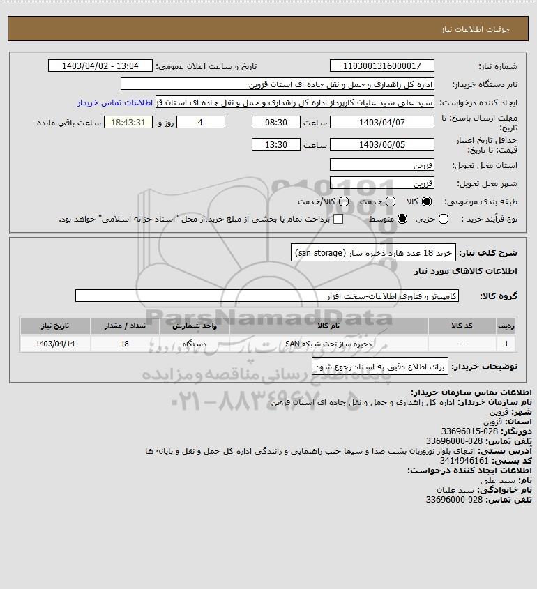 شرح کلی نیاز: خرید 18 عدد هارد ذخیره ساز (san storage)
