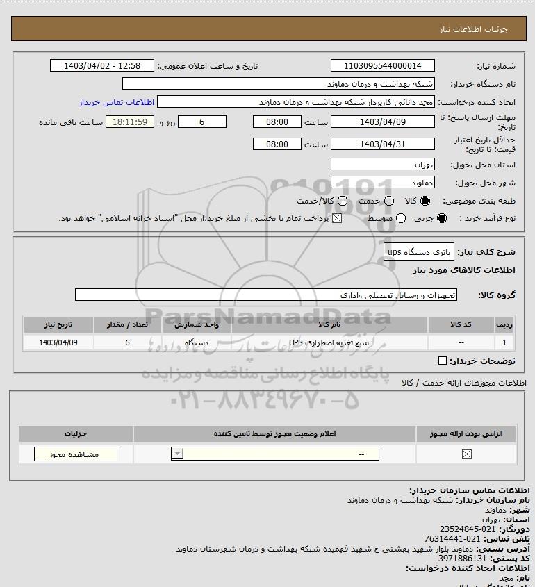 | 1 | -- | منبع تغذیه اضطراری UPS | دستگاه | 6 | 1403/04/09 |