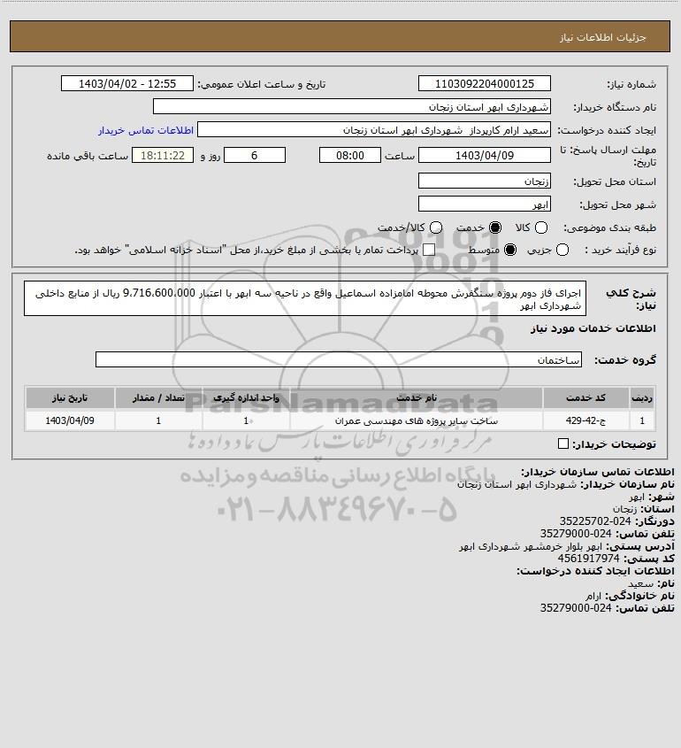 شرح کلی نیاز: اجرای فاز دوم پروژه سنگفرش محوطه امامزاده اسماعیل واقع در ناحیه سه ابهر با اعتبار 9،716،600،000 ریال از منابع داخلی شهرداری ابهر
