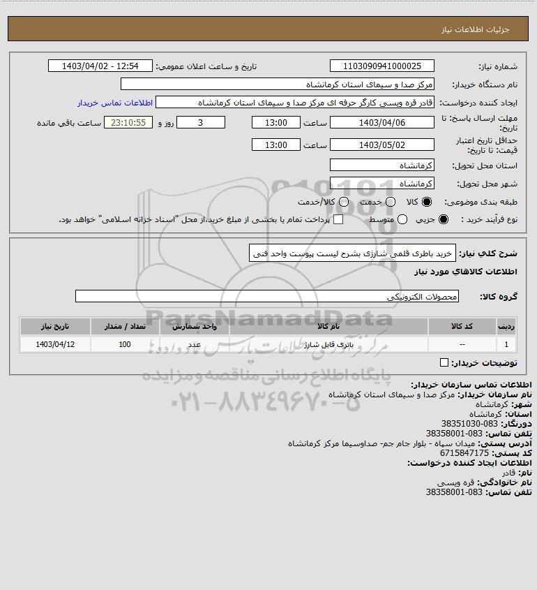 شرح کلی نیاز: خرید باطری قلمی شارژی بشرح لیست پیوست واحد فنی