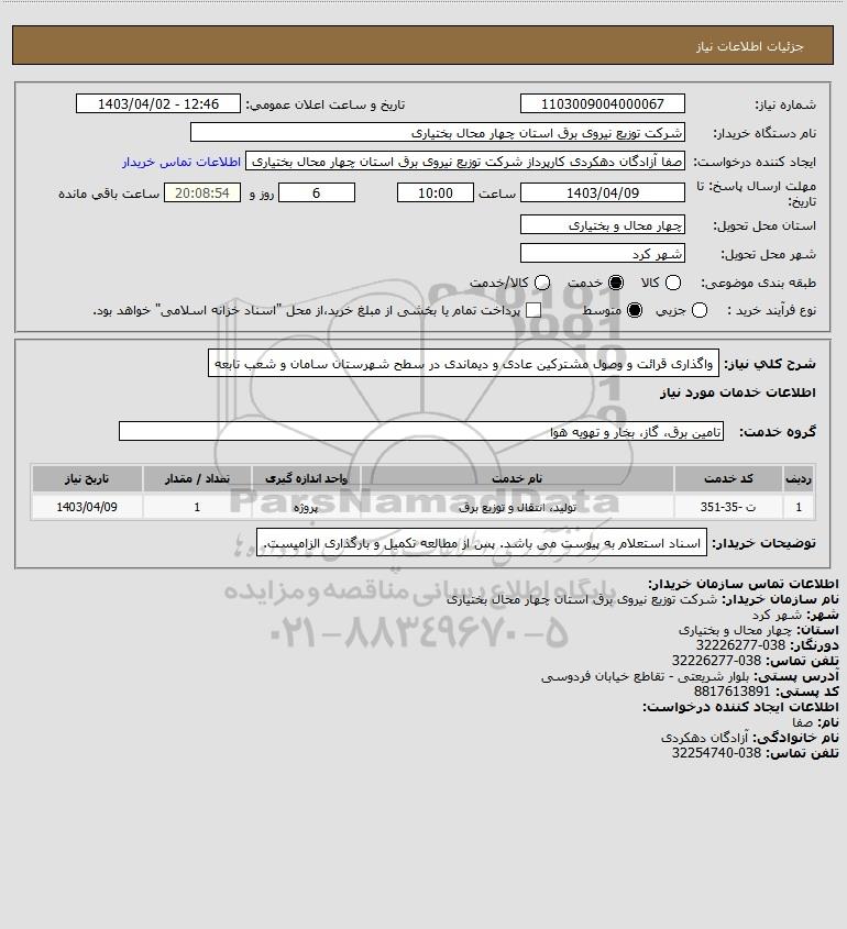 شرح کلی نیاز: واگذاری قرائت و وصول مشترکین عادی و دیماندی در سطح شهرستان سامان و شعب تابعه