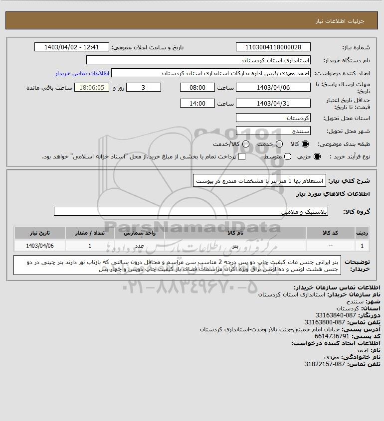 شرح کلی نیاز: استعلام بها 1 متر بنر با مشخصات مندرج در پیوست