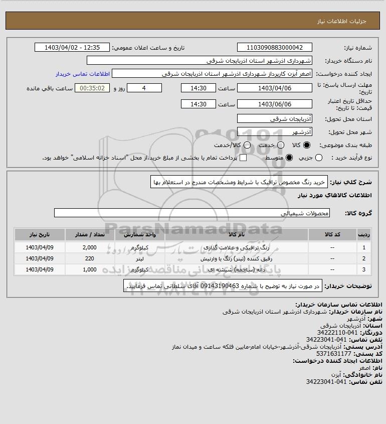 شرح کلی نیاز: خرید رنگ مخصوص ترافیک با شرایط ومشخصات مندرج در استعلام بها