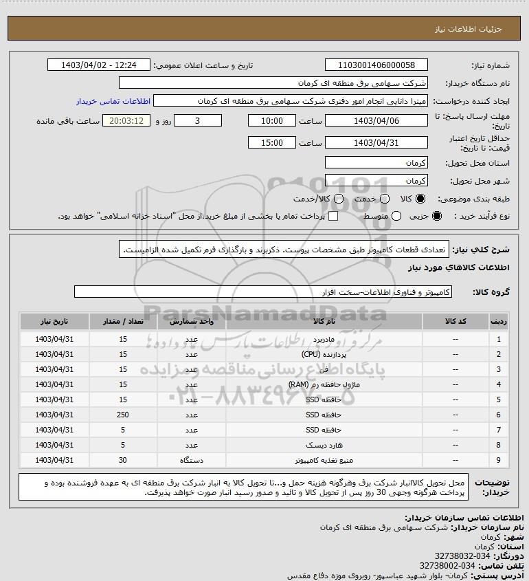 نام سازمان خریدار: شرکت سهامی برق منطقه ای کرمان