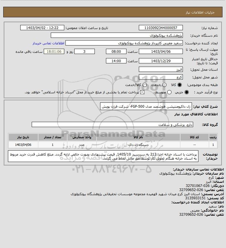 نام دستگاه خریدار:پژوهشکده بیوتکنولوژی