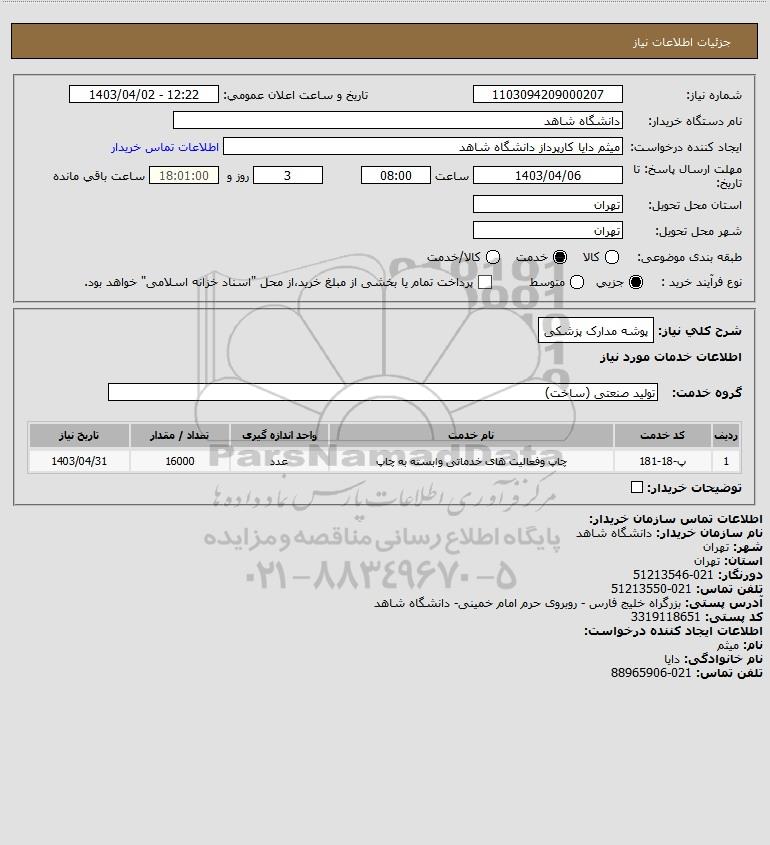 استعلام بها و موضوع استعلام استعلام پوشه مدارک پزشکی به اطلاع کلیه شرکتها و افراد متخصص واجد شرایط میرساند، آگهی گذار در نظر دارد از طریق استعلام بها، نسبت به انتخاب و دریافت پیشنهادات اقدام نماید. این استعلام با کد آگهی ثبت شده در سامانه خبرگزاری پارس نماد : 7624861 منتشر شده است. مشخصات استعلام : تاریخ شروع استعلام: 1403/04/02 آخرین مهلت ارسال پیشنهاد قیمت : 1403/04/06 و محل اجرای پروژه : استان تهران میباشد. استعلام قیمت مورد درخواست : استعلام پوشه مدارک پزشکی با دستهبندیهای تخصصی و گروه های مرتبط : طراحی چاپ و تبلیغات, نوشت افزار, استعلام اطلاع رسانی میگردد.
