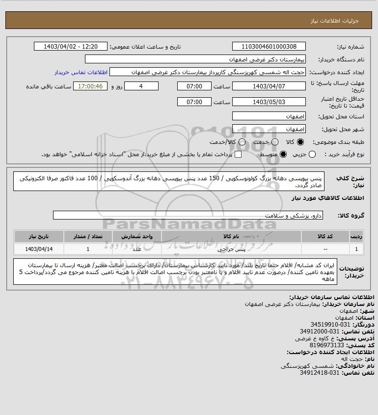 شرح کلی نیاز: پنس بیوپسی دهانه بزرگ کولونوسکوپی / 150 عدد پنس بیوپسی دهانه بزرگ آندوسکوپی / 100 عدد فاکتور صرفا الکترونیکی صادر گردد.