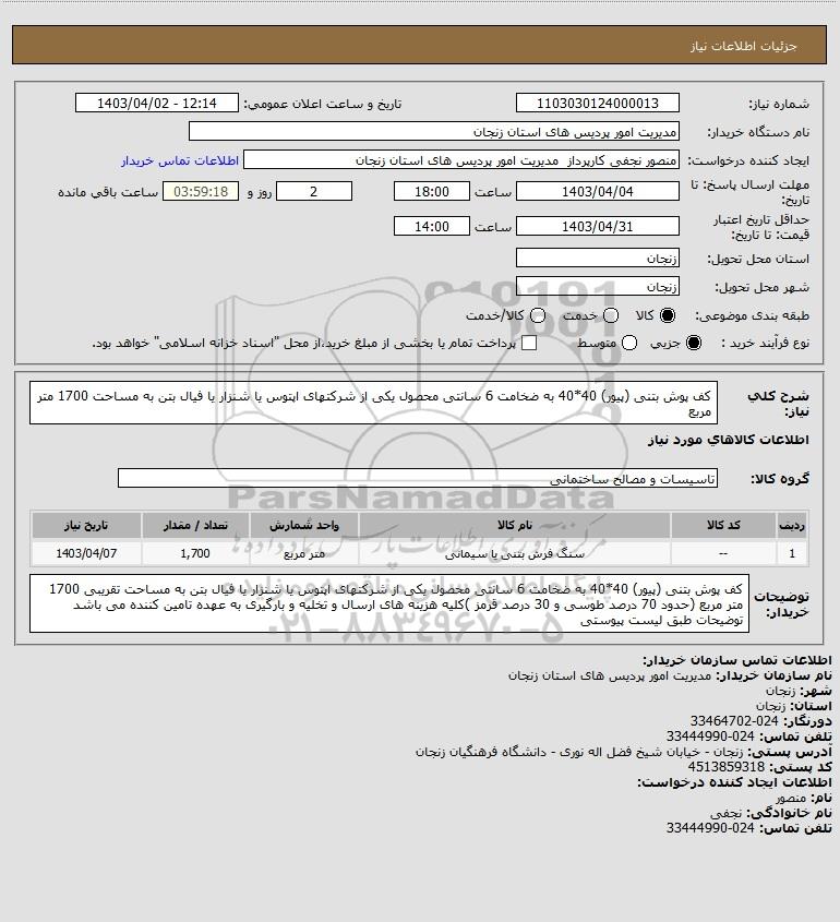 شرح کلی نیاز: کف پوش بتنی (پیور) 40*40 به ضخامت 6 سانتی محصول یکی از شرکتهای اپتوس یا شنزار یا فیال بتن به مساحت 1700 متر مربع