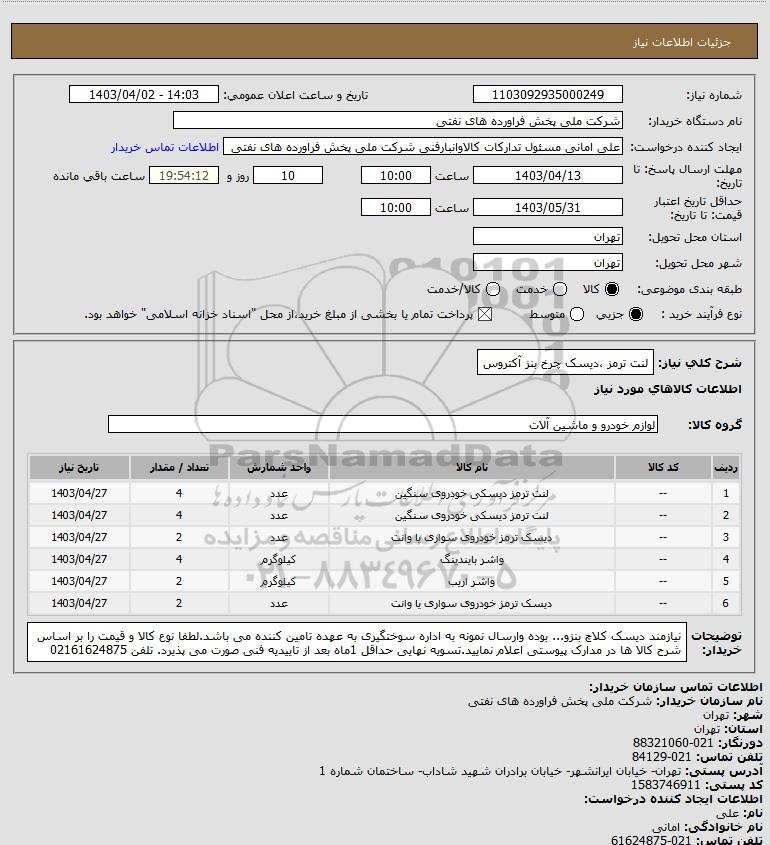 | 6 | -- | دیسک ترمز خودروی سواری یا وانت | عدد | 2 | 1403/04/27 |