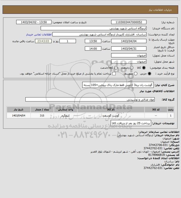 شرح کلی نیاز: گوشت ران بره3 کیلویی فقط مارک رناک پروتئین=105 بسته