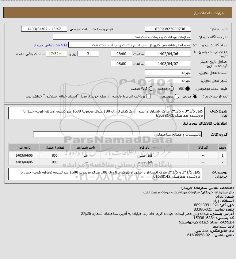 شرح کلی نیاز: کابل 1/5*3 و 1/5*2 مارک افشارنژاد اصلی از هرکدام 8 رول 100 متری مجموعا 1600 متر تسویه 2ماهه هزینه حمل با فروشنده هماهنگی61638143
