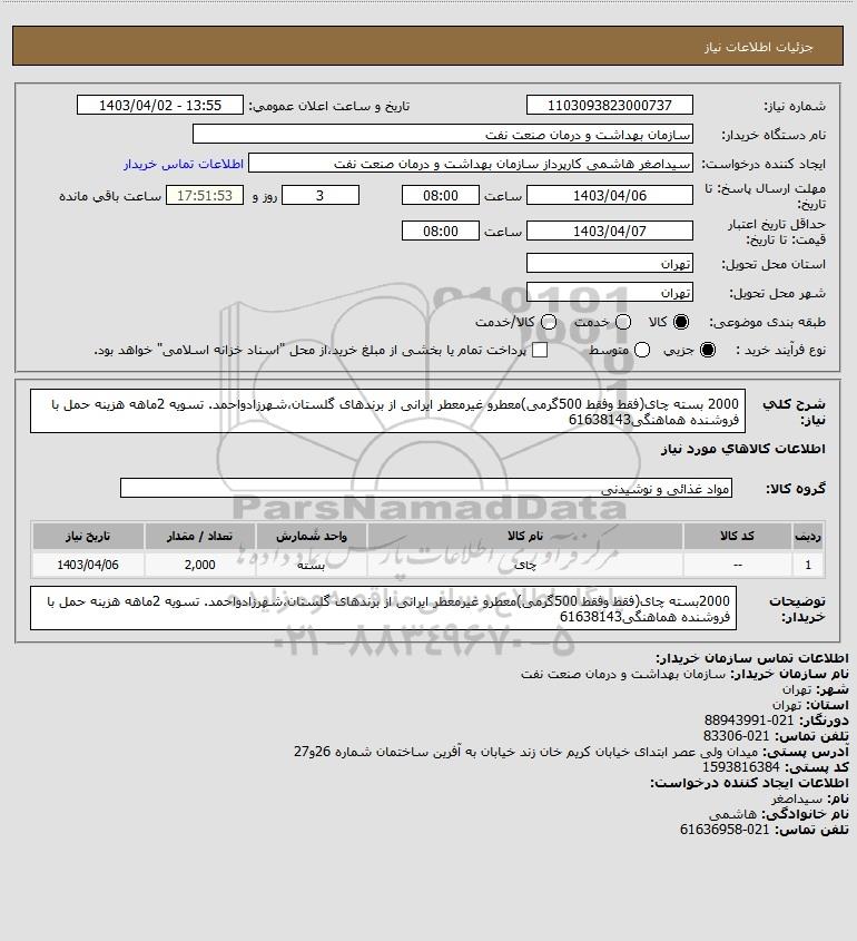 شرح کلی نیاز: 2000 بسته چای(فقط وفقط 500گرمی)معطرو غیرمعطر ایرانی از برندهای گلستان،شهرزادواحمد.