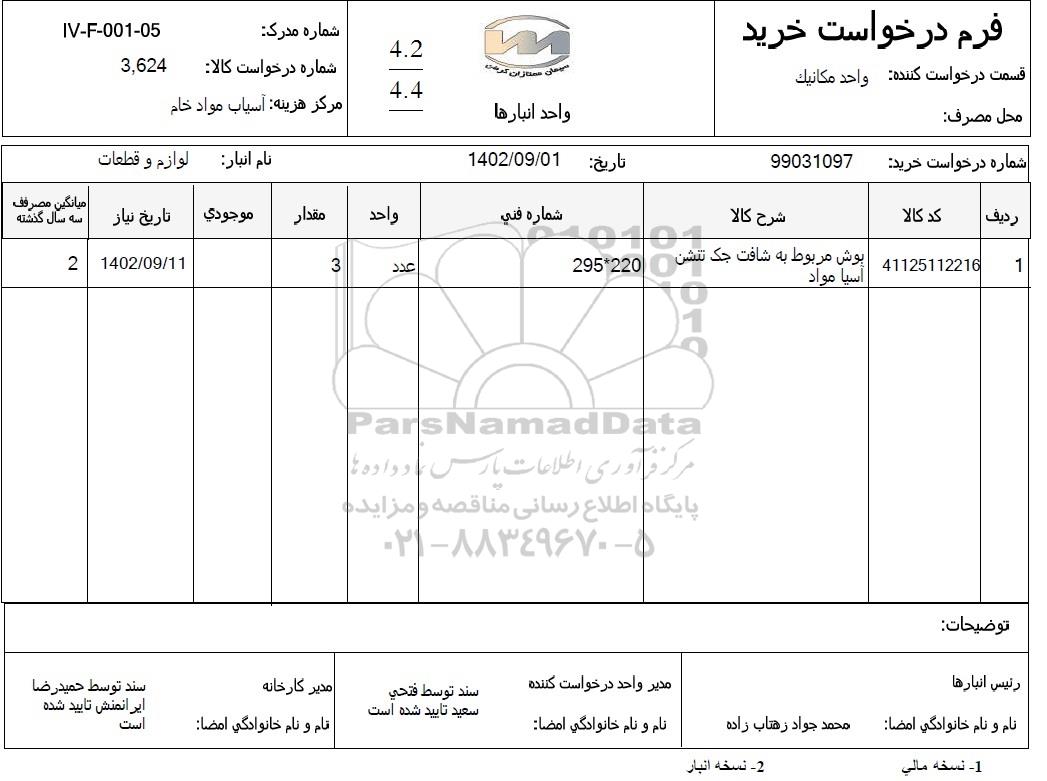| 1 | 41125112216 | بوش مربوط به شافت جک تنشن آسیا مواد | 220 * 295 | عدد | 3 | 1402.9.11 | 2 |