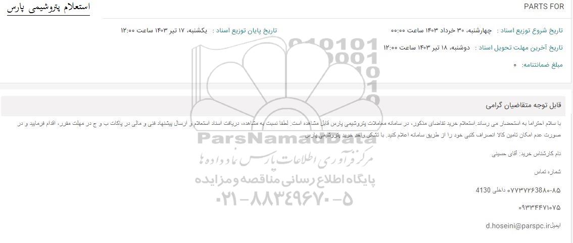 استعلام پتروشیمی پارس با سلام احتراما به استحضار میرساند. استعلام خرید تقاضای مذکور در سامانه معاملات پتروشیمی پارس قابل مشاهده است. لطفا نسبت به مشاهده دریافت اسناد استعلام و ارسال پیشنهاد فنی و مالی در پاکات ب و ج در مهلت مقرر اقدام فرمایید و در صورت عدم امکان تامین کالا انصراف کتبی خود را از طریق سامانه اعلام کنید.