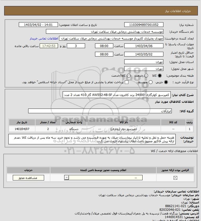شرح کلی نیاز: کمپرسور کولرگازی 24000 برند کالترون مدل AW552-4B-SF گاز 410 تعداد 2 عدد