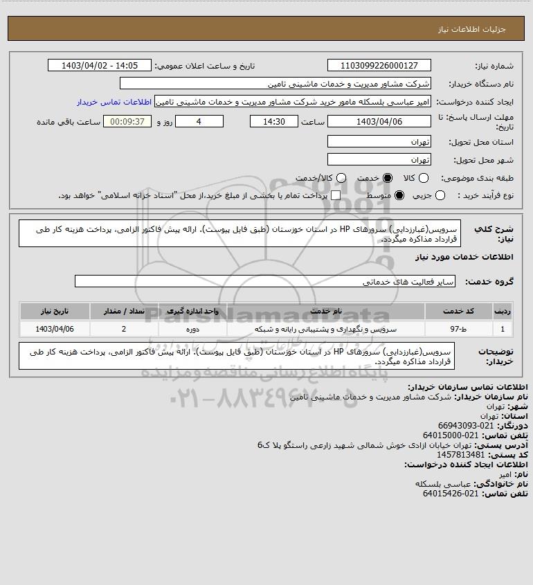 شرح کلی نیاز: سرویس(غبارزدایی) سرورهای HP در استان خوزستان (طبق فایل پیوست). ارائه پیش فاکتور الزامی، پرداخت هزینه کار طی قرارداد مذاکره میگردد.