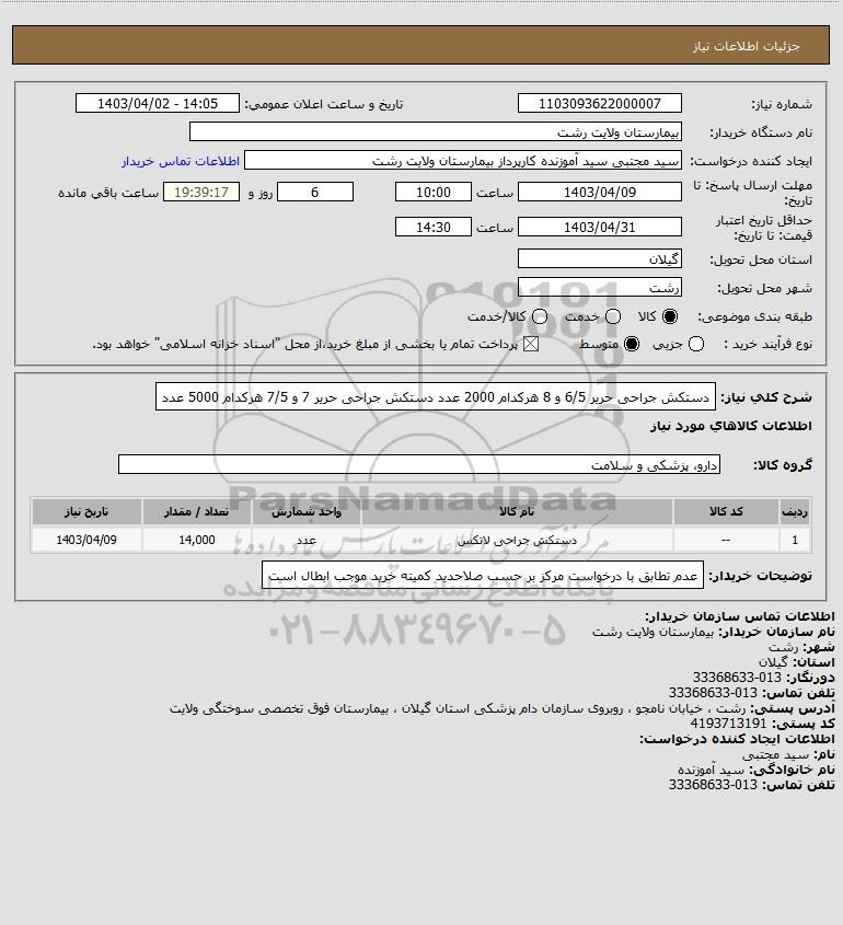 شرح کلی نیاز: دستکش جراحی حریر 6/5 و 8 هرکدام 2000 عدد دستکش جراحی حریر 7 و 7/5 هرکدام 5000 عدد