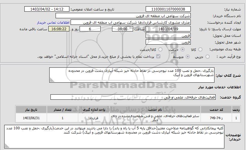 شرح کلی نیاز: بارگیری ،حمل و نصب 100 عدد نیوجرسی در نقاط حادثه خیز شبکه آبیاری دشت قزوین در محدوده شهرستانهای قزوین و آبیک