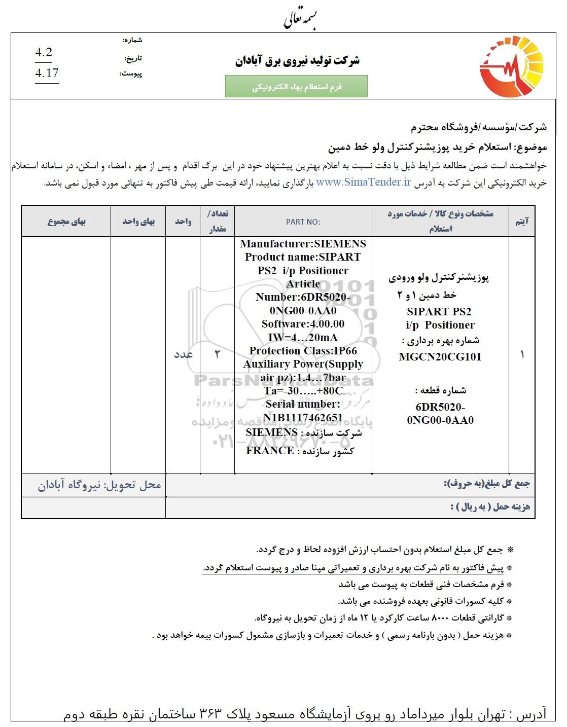 استعلام خرید پوزیشنر کنترل ولو خط دمین , استعلام خرید پوزیشنر کنترل ولو خط دمین