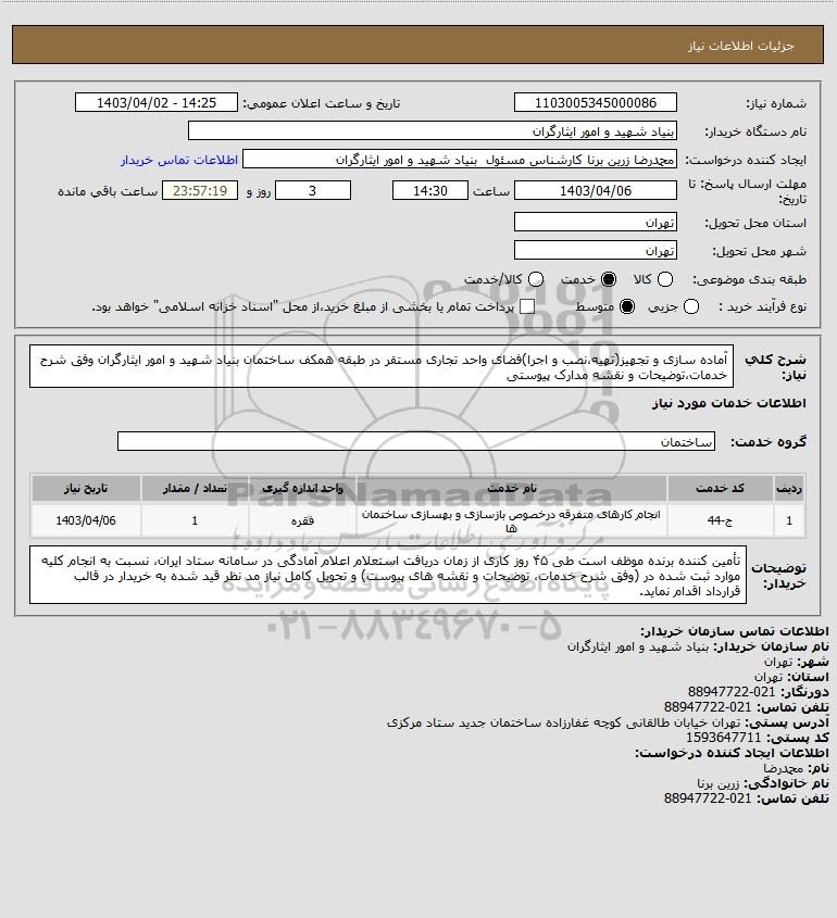 شرح کلی نیاز: آماده سازی و تجهیز(تهیه،نصب و اجرا)فضای واحد تجاری مستقر در طبقه همکف ساختمان بنیاد شهید و امور ایثارگران وفق شرح خدمات،توضیحات و نقشه مدارک پیوستی