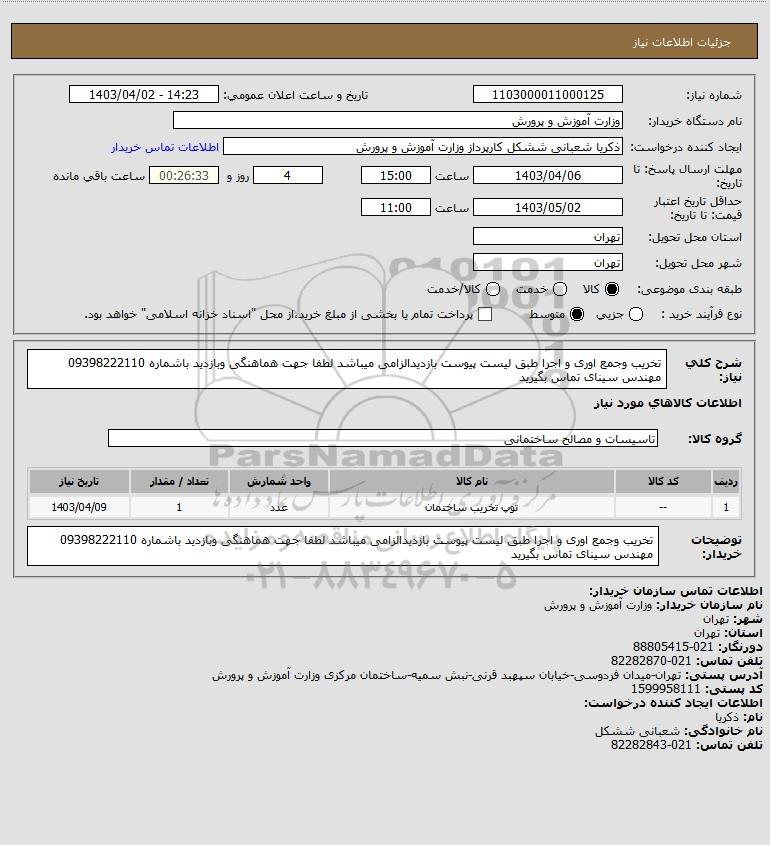 شرح کلی نیاز: تخریب وجمع اوری و اجرا طبق لیست پیوست بازدیدالزامی میباشد لطفا جهت هماهنگی وبازدید باشماره 09398222110