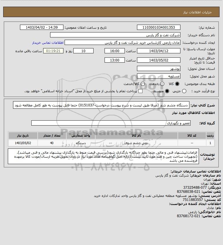 استعلام دستگاه چشم شور (صرفا طبق لیست و شرح پیوست درخواست-0151037) حتما فایل پیوست به طور کامل مطالعه شود, استعلام دستگاه چشم شور (صرفا طبق لیست و شرح پیوست درخواست-0151037) حتما فایل پیوست به طور کامل مطالعه شود