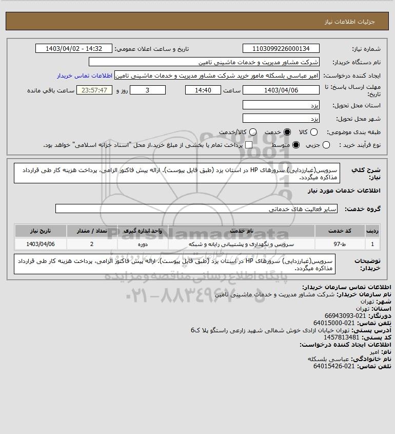 استعلام سرویس(غبارزدایی) سرورهای HP در استان یزد (طبق فایل پیوست). ارائه پیش فاکتور الزامی، پرداخت هزینه کار طی قرارداد مذاکره میگردد., استعلام سرویس(غبارزدایی) سرورهای HP در استان یزد (طبق فایل پیوست). ارائه پیش فاکتور الزامی، پرداخت هزینه کار طی قرارداد مذاکره میگردد.