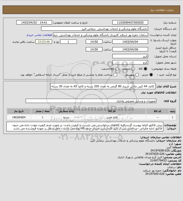شرح کلی نیاز: کاغذ A4 کپی مکس شیراز 80 گرمی به تعداد 200 بسته و کاغذ A5 به تعداد 30 بسته