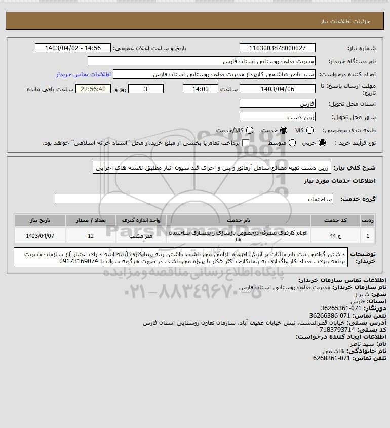 شرح کلی نیاز: زرین دشت-تهیه مصالح شامل آرماتور و بتن و اجرای فنداسیون انبار مطلبق نقشه های اجرایی