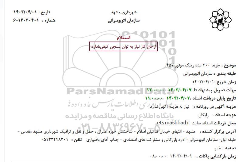 استعلام بها و موضوع استعلام استعلام خرید 300 عدد رینگ موتور 457 به اطلاع کلیه شرکتها و افراد متخصص واجد شرایط میرساند، آگهی گذار در نظر دارد از طریق استعلام بها، نسبت به انتخاب و دریافت پیشنهادات اقدام نماید. این استعلام با کد آگهی ثبت شده در سامانه خبرگزاری پارس نماد : 7625649 منتشر شده است. مشخصات استعلام : تاریخ شروع استعلام: 1403/04/02 آخرین مهلت ارسال پیشنهاد قیمت : 1403/04/07 و محل اجرای پروژه : استان خراسان رضوی میباشد. استعلام قیمت مورد درخواست : استعلام خرید 300 عدد رینگ موتور 457 با دستهبندیهای تخصصی و گروه های مرتبط : تامین،تعمیرات و اجاره خودروهای سنگین و نیمه سنگین, قطعات خودرو, استعلام اطلاع رسانی میگردد.