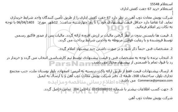 شرکت پویش معادن ذوب آهن در نظر دارد 67 جفت کفش اداری را از طریق تأمین کنندگان واجد شرایط خریداری نماید. لذا تقاضا دارد حداقل قیمت پیشنهادی خود را تا روز چهارشنبه ساعت 12 ظهر مورخ 1403.4.06 با توجه به نکات زیر اعلام فرمائید.