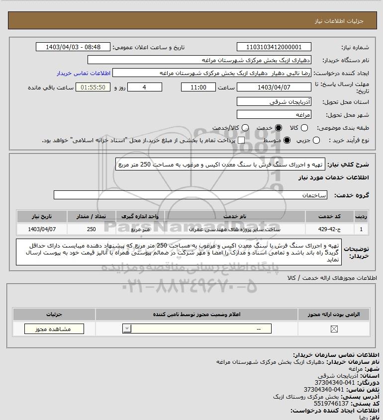 شرح کلی نیاز: تهیه و اجررای سنگ فرش با سنگ معدن اکیس و مرغوب به مساحت 250 متر مربع