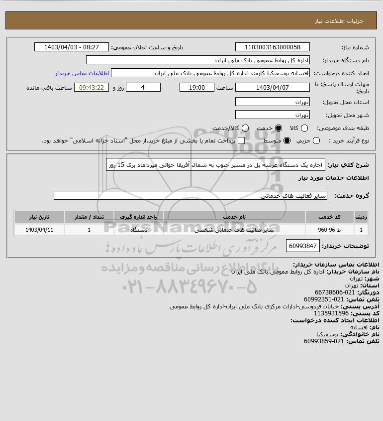 شرح کلی نیاز: اجاره یک دستگاه عرشه پل در مسیر جنوب به شمال آفریقا حوالی میرداماد بری 15 روز