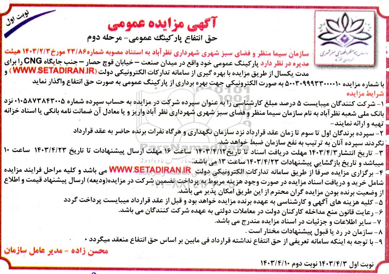 سازمان سیما منظر و فضای سبز شهری شهرداری نظر آباد به استناد مصوبه شماره 23.86 مورخ 1403.2.3 هیئت مدیره در نظر دارد پارکینگ عمومی خود واقع در میدان صنعت خیابان قوج حصار جنب جایگاه CNG را برای مدت یکسال از طریق مزایده با بهره گیری از سامانه تدارکات الکترونیکی دولت ستاد ایران و با شماره مزایده 5003099933000010 به صورت الکترونیکی جهت بهره برداری از پارکینگ عمومی به صورت حق انتفاع واگذار نماید.