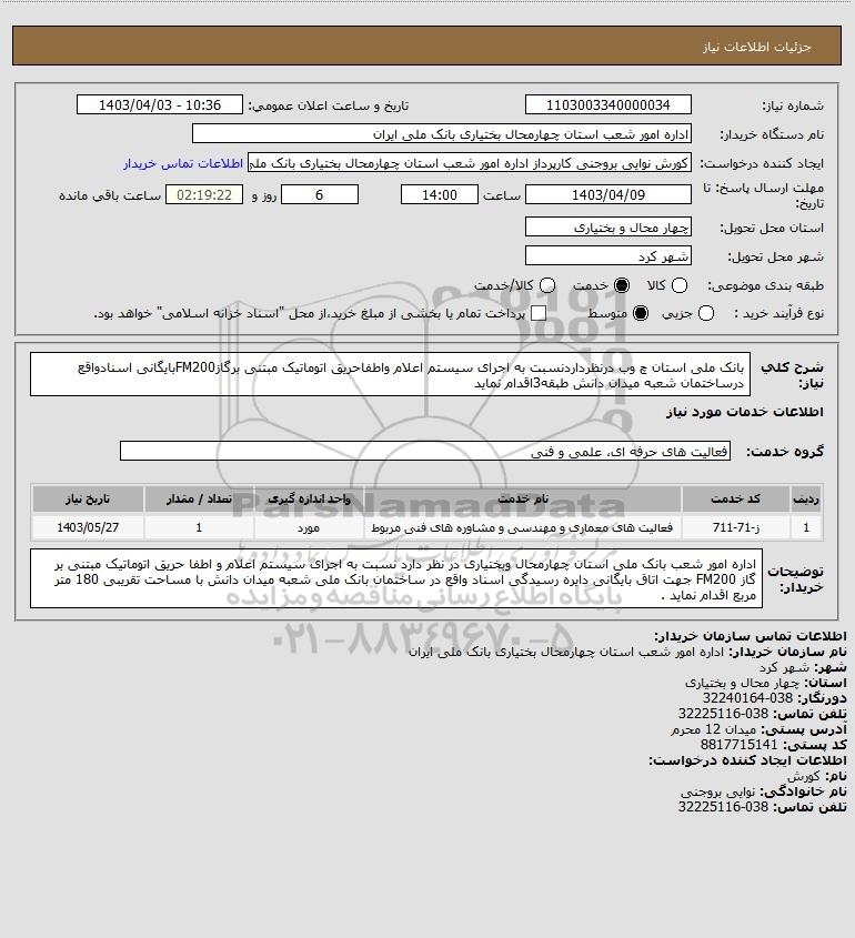 نام دستگاه خریدار:اداره امور شعب استان چهارمحال بختیاری بانک ملی ایران