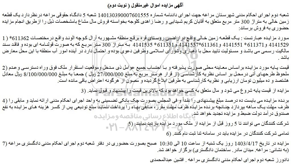شعبه دوم اجرای احکام مدنی شهرستان مراغه جهت اجرای دادنامه شماره 140130390007601555 شعبه 5 دادگاه حقوقی مراغه درنظردارد یک قطعه زمین خالی به متراژ 300 متر مربع متعلق به آقایان کریم شیدایی و رضا زاهدی کلوجه بخواسته فروش مال مشاع بامشخصات ذیل را ازطریق انجام مزایده حضوری به فروش برساند: