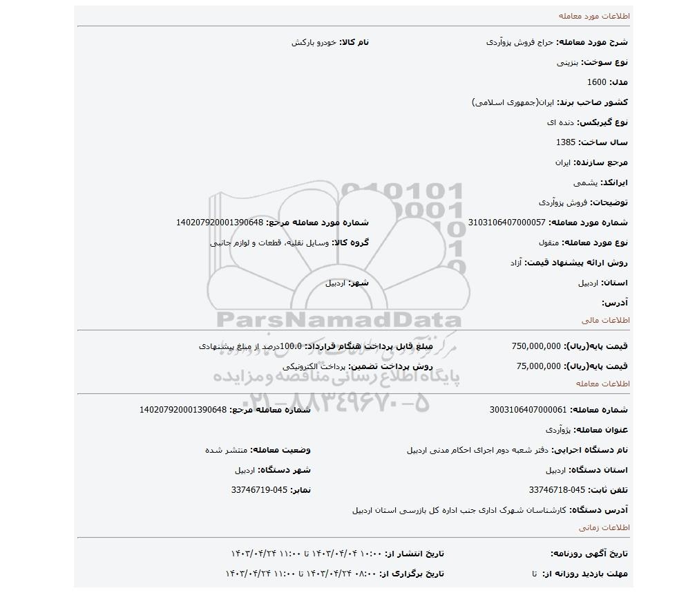شرح مورد معامله: حراج فروش پزوآردی | نام کالا: خودرو بارکش | |