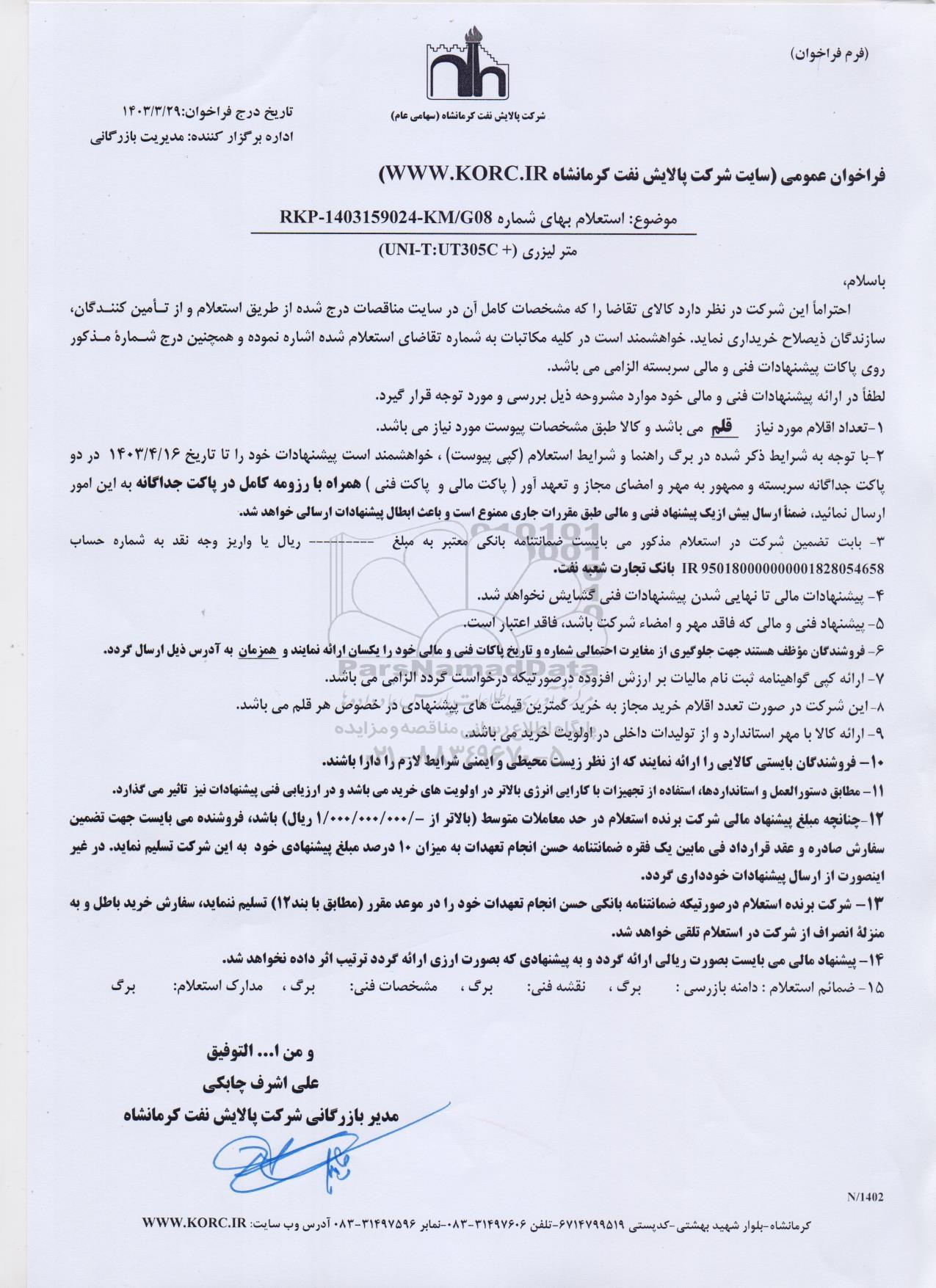 موضوع: استعلام بهای شماره: RKP - 1403159024- KM/G08