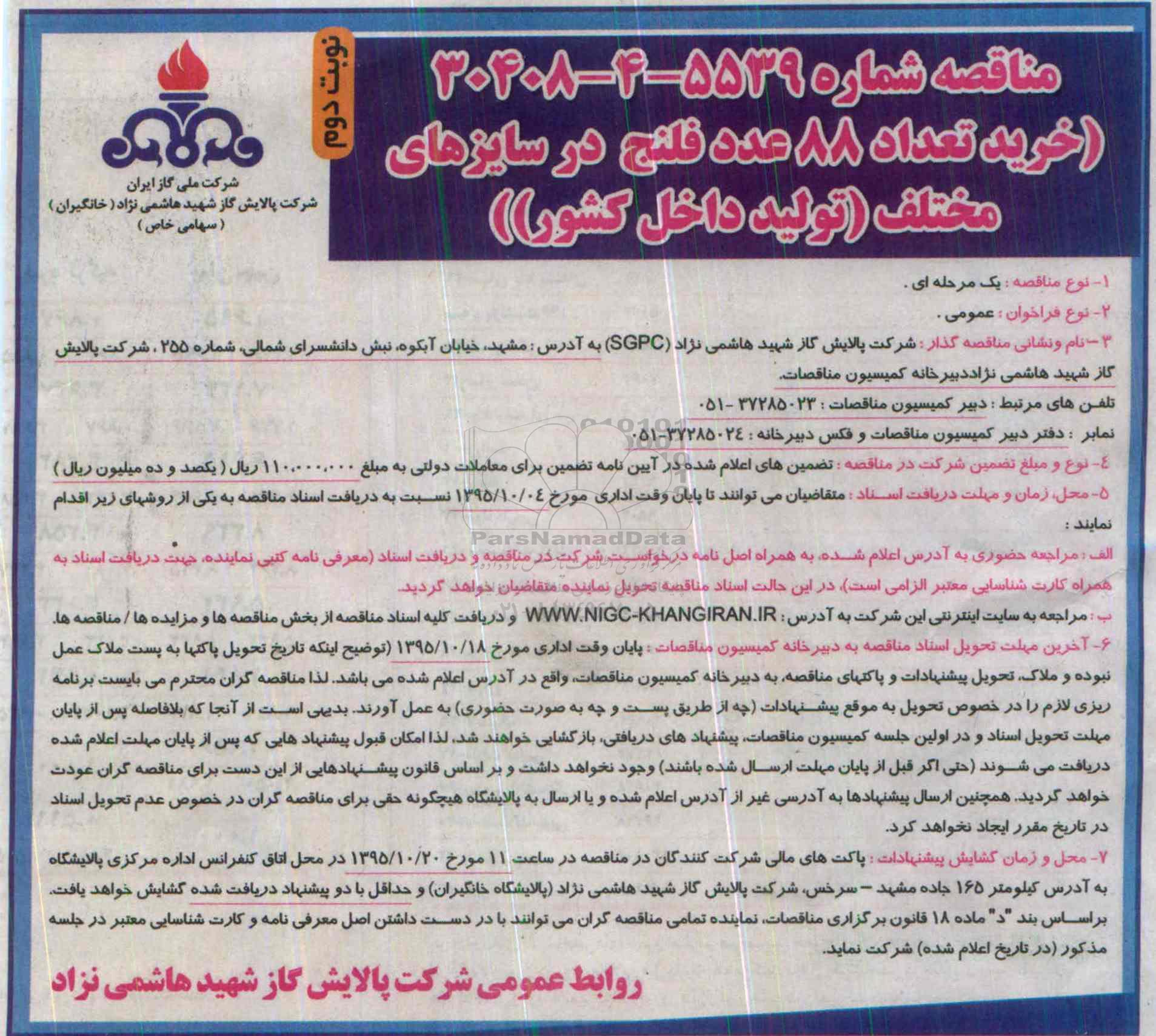 7-محل و زمان گشایش پیشنهادات: پاکت های مالی شرکت کنندگان در مناقصه در ساعت 11 مورخ 95.10.20  در محل اتاق کنفرانس اداره مرکزی پالایشگاه  به آدرس کیلومتر 165 جاده مشهد - سرخس شرکت پالایش گاز شهید هاشمی نژاد (پالایشگاه خانگیران و حداقل با دو پیشنهاد تایید شده گشایش خواهد یافت.براساس بند د ماده 18 قانون برگزاری مناقصات نماینده تمامی مناقصه گران می توانند با در دست داشتن اصل معرفی نامه و کارت شناسایی معتبر در جلسه مذکور در تاریخ اعلام شده شرکت نماید .