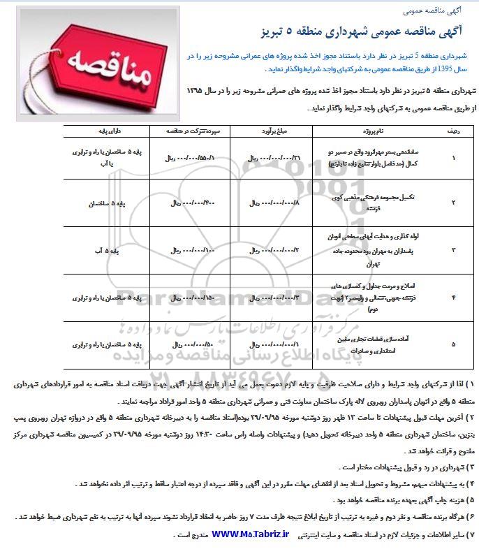 شهرداری منطقه 5 تبریز در نظر دارد باستناد مجوز اخذ شده پروژه های عمرانی مشروحه زیر را در سال 1395 از طریق مناقصه عمومی به شرکتهای واجد شرایط واگذار نماید .
