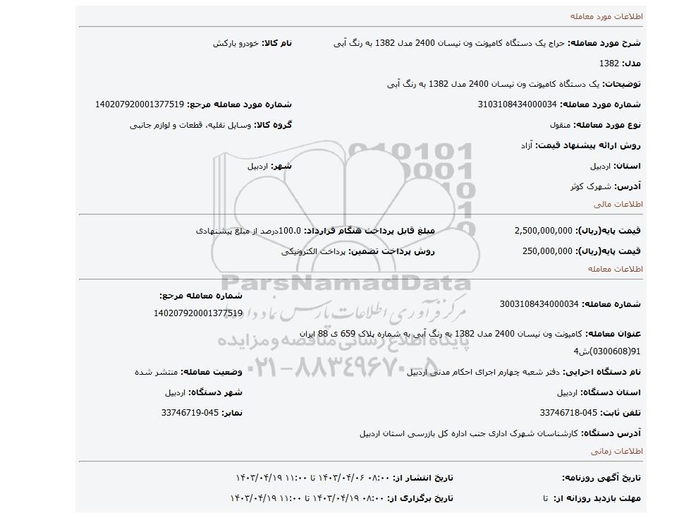 عنوان معامله: کامیونت ون نیسان 2400 مدل 1382 به رنگ آبی به شماره پلاک 659 ی 88 ایران 91(0300608)ش4