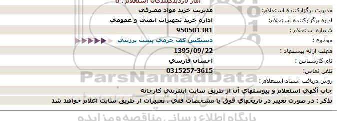 استعلام بها و موضوع استعلام استعلام دستکش کف چرمی پشت برزنتی به اطلاع کلیه شرکتها و افراد متخصص واجد شرایط میرساند، آگهی گذار در نظر دارد از طریق استعلام بها، نسبت به انتخاب و دریافت پیشنهادات اقدام نماید. این استعلام با کد آگهی ثبت شده در سامانه خبرگزاری پارس نماد : 764751 منتشر شده است. مشخصات استعلام : تاریخ شروع استعلام: 1395/09/17 آخرین مهلت ارسال پیشنهاد قیمت : 1395/09/22 و محل اجرای پروژه : استان اصفهان میباشد. استعلام قیمت مورد درخواست : استعلام دستکش کف چرمی پشت برزنتی با دستهبندیهای تخصصی و گروه های مرتبط : البسه و پوشاک, سیستم ایمنی ، اتش نشانی،اعلام و اطفای حریق, استعلام اطلاع رسانی میگردد.