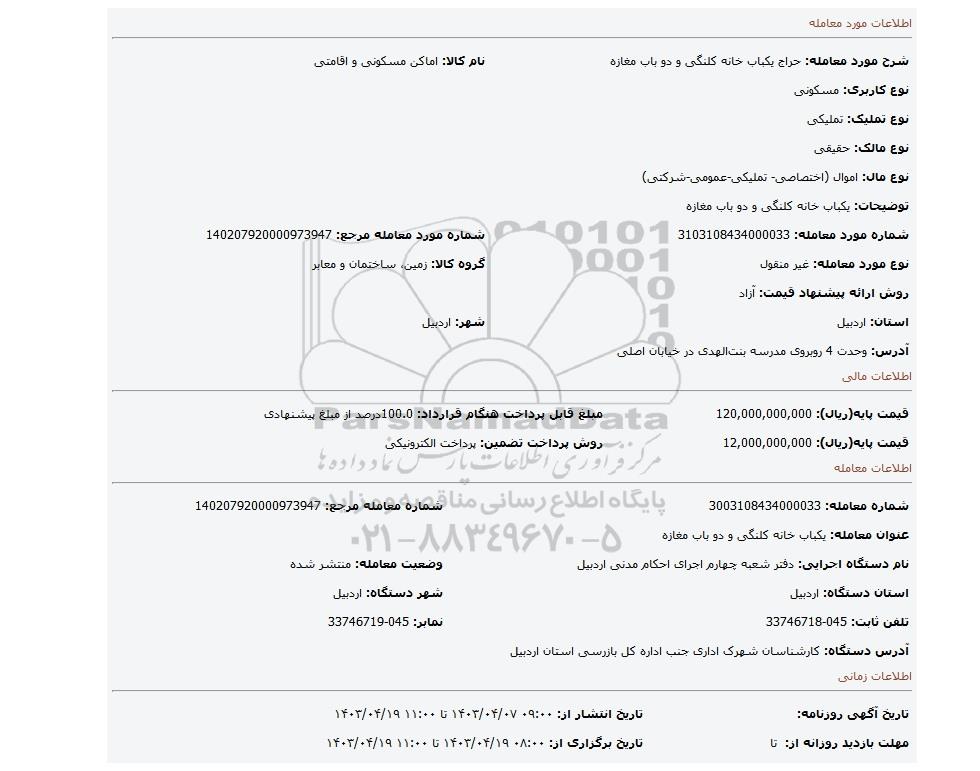 قیمت پایه(ریال): 12,000,000,000روش پرداخت تضمین: پرداخت الکترونیکی