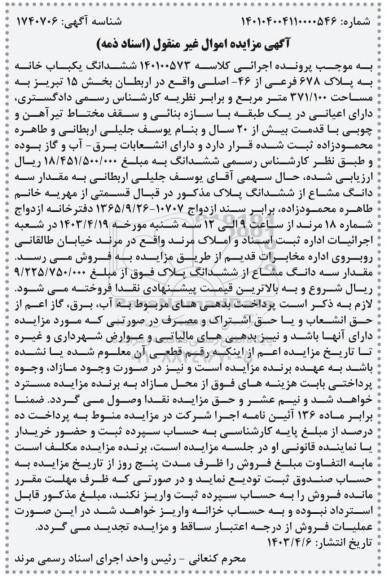 مزایده فروش ششدانگ یکباب خانه به پلاک 678 فرعی از 46 - اصلی واقع در اربطان بخش 15 تبریز